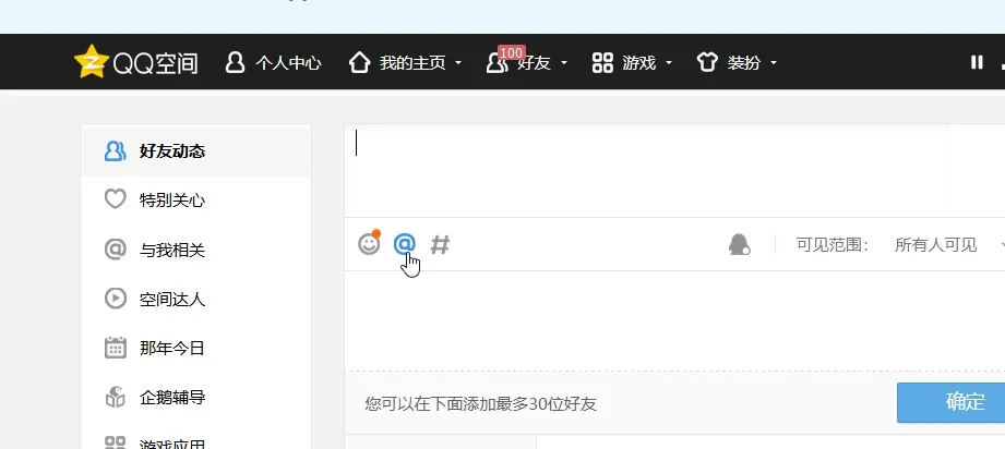 接下来点击好友动态,准备发一条说说。点一下 @ 符号,好友列表就从下面冒出来了。